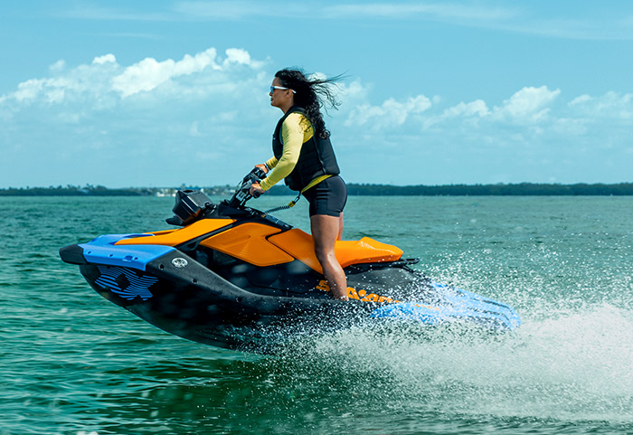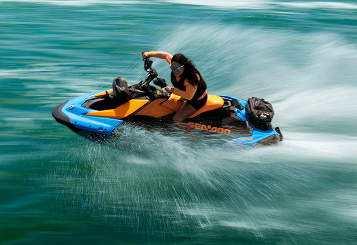 Disponível na versão para 1 pessoa, com assento freestyle, motor 900 ACE de 90 hp e nova combinação de cores em Azul Gulfstream e Laranja Crush.